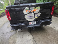 PAW put on the back.Then I told Mrs. Spud. She was non-plussed, but so far all of my men friends like it. I played around with it and decided to do the GMC in Orange and the Denali in Purple. That chrome was tough for Jared to get flat and not sure how long it will hold up...But, I am very happy with his work. Shoot me a tmail if you want his number.