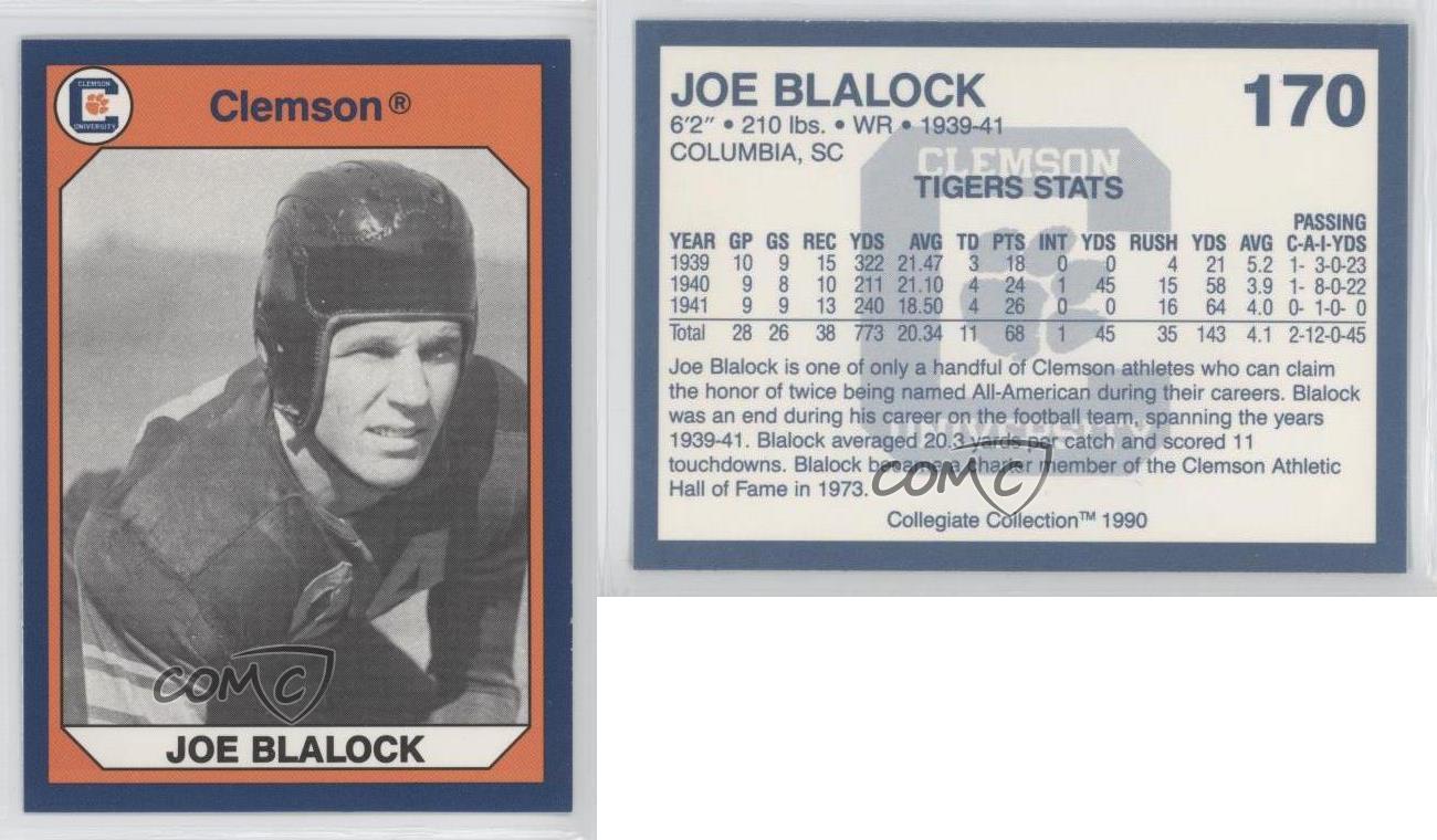 “Joe Blalock was Clemson’s first two-time All-American in Clemson sports history. Blalock was a star wide receiver for the Tigers from 1939-41 and was an All-American in 1940 and 1941. Longevity of a record is certainly a testimony to someone’s greatness. While Joe DiMaggio was setting his incredible 56-game hitting streak in 1941, Joe Blalock was ending his Clemson career with a 20.34 yards per reception record, a mark that still stands today.