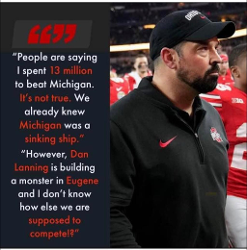 These quotes make no sense to me. Why would Ryan Day, working to hold his roster together, basically tell anyone listening that Oregon is in a better situation. Or basically throw his own program under the bus claiming Michigan is a sinking ship as Ohio State has lost 3 in a row? I know Dabo’s famous rant came in year 3 of our skid against South Carolina, but that was a full throated defense of our school and history predicated on comments from Todd Ellis that were misattributed to Steve Spurrier. And he certainly didn’t declare that South Carolina was a “sinking ship” or mock the future of their program.