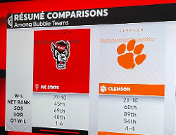 Only one number in that picture where Clemson was better than NC State. What that picture doesn’t show is that we had four losses to teams that are either quad four or spent time in quad 4 during the season and were borderline quad 4 teams. I bet NC State didn’t have a single quad 4 loss. At most maybe one. It’s not just about wins. Losses matter also. That picture proves my point and the only thing you can point to was cherry picking one statistic without looking at other statistics that are equally or more important.