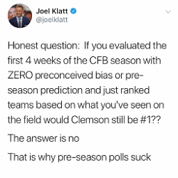 This guy's question does not even support his point. We ARE after 4 weeks and Clemson is #1. What does that have to do with pre-season polls?
