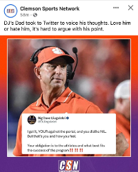 Although I agree with his Statement, he LOVES to deflect any Accountability for His Son’s Performance. Facts are that Dabo and the CU Program provided the Platform and Brand for DJU to have a Dr. Pepper NIL deal and Bojangles deal. He rewarded his “Sponsors” with sub-par performances week after week!
