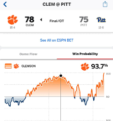 Clemson in first half by double digits. Looked good. Second half lost lead, Pitt mugged the hail out of zclemson while refs laughed and effed them on and game went to overtime. Clemson whipped refs az, and Pitt's ### in OT.