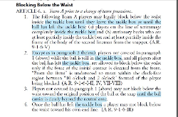 "An illegal crack-back block is a block below the waist. Players outside the tackle box (more than seven yards out) or a player in motion cannot block another player below the waist until after the ball is snapped and significant time has run off the clock. After time has run off the clock, any player may be blocked below the waist as long as the blocking player is in front of the player being blocked or is within a 10 o’clock to 2 o’clock zone."