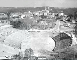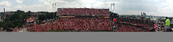 a closing in with the facade being an awesome front door to the stadium. Make the bottom of the facade still about 3 feet off the ground. This preserves the view of the inside of the stadium while coming down the hill from Calhoun mansion and also the stadium hill for the team to run down. As far as being able to see the campus from the open end of the stadium, first a couple of points to make. That view could be awesome, but as it is now, it is not awesome. The p-plant ruins that view. I like the view of the dorm on the southeast corner, but the northeast corner is mostly p-plant smokestack. A couple of row tall spruce pines in front of the p-plant building has been needed there for years. It would at least hide the shabby building itself. But back to the original topic. A closed in eastzone would not block the camera, or stadium seating view of the campus. It would not be high enough to block that whole panarama. I mean the Westzone didn't block the view of the lake and Littlejohn and that ground is lower than the westzone. The campus is much higher than the eastzone.