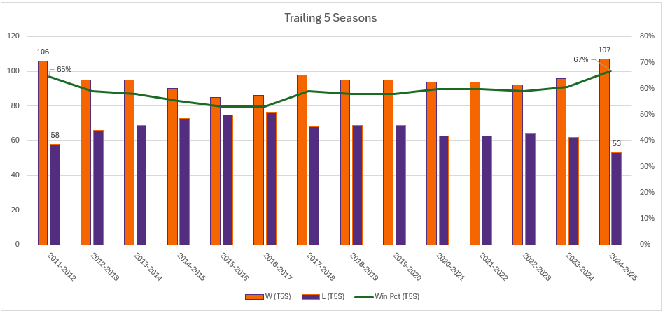 Heck one could make an argument that we should look at trailing averages to normalize for anomalies and potentially track growth of the program. Sans the COVID super-senior phenomenon, most players can stay a MAX of 5 years. This is what this would look like.