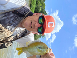 hybrid between the smallie and a spot from what I have been told. I caught two of those bream on a crankbait and they were beautiful. When you turned them in the sun just right they had a turqoise/teal band down their side. They were about three quarters of a pound. Annnnnd, I caught those smallies in a spot on the river where I had NEVER caught a fish in 30 years....That just proved that a river changes.....you just never know...you just trust your gut that you need to try it,LOL! Kind of like when Danny ran out of tailbacks that spring and said,"Ok...let's see what Terry looks like over there..".
