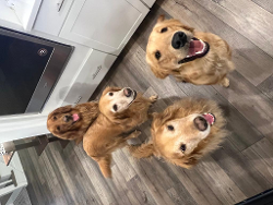 Pic #1 is Breck - 4 year old from only litter we ever had, been with that dog since day 1 Pic #2 is Sunny - He is 11 months old and although he looks cute, he is a little sh>it and makes me question having dogs sometimes. He is also my favorite dog ever. Pic #3 is the whole crew. Breck in back, Hank to the left, Sunny to the right, and Belle standing in the middle because she is too stupid to sit on command.