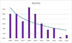 There was a dude named pheebo who posted some completely inaccurate math, trying to show we’ve been in a “steady decline” since 2021. His math was all screwed up. Either he doesn’t understand simple winning percentages, or his calculator is broken. While his bizarre winning percentage numbers showed a “steady decline”, his numbers were completely wrong for every subject year (2021-2024) he posted. Here are the actual numbers.